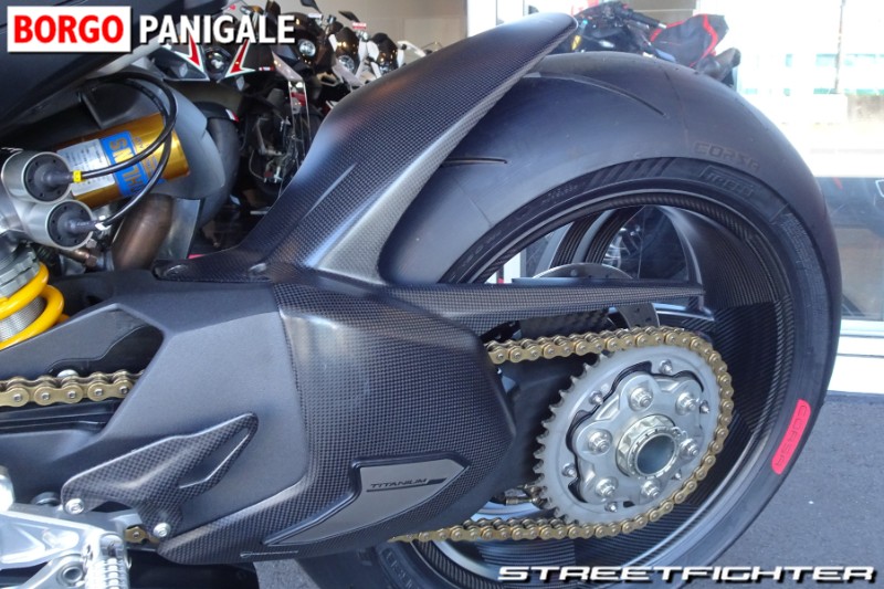 ドゥカティパフォーマンス製のドライカーボンリヤフェンダーや、チタニウムプロテクション付きカーボンスイングカバーもオプション装着。