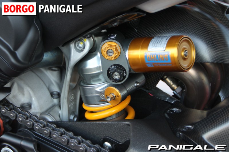 リヤにはオーリンズ製TTX36ショックアブソーバーを組み合わせ、さらにスイングアームの標準ピボット位置を1mm引き上げることで、リアの車高を20mmアップ。