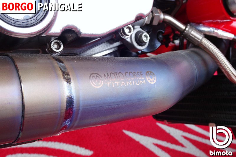 エキゾーストシステムは、MOTO CORSEのエボルツォーネ。美しく軽量なチタン製の逸品を採用しております。