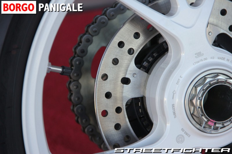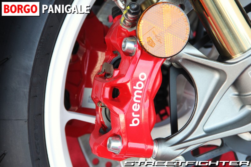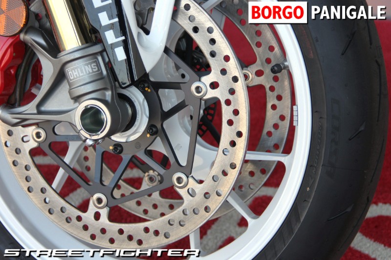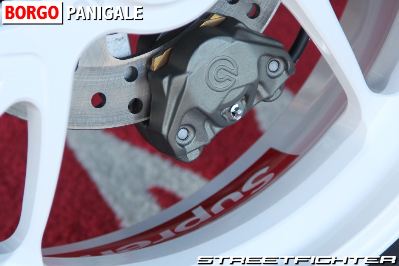 フロントブレーキキャリパーには、専用のカラーリングを施されたbrembo製Stylemaモノブロックキャリパーが採用されております。M50キャリパーと比べて小型軽量化と高剛性化、放熱性が向上しており、サーキット走行などの激しいライディングでも安定した性能を発揮します。Panigale V4とは異なりスポーツ性と耐摩耗性をバランスさせたブレーキパッドが装備されております。330mm径のローターと組合さり、抜群のブレーキシステムを進化、リヤブレーキは245 mmディスク、ブレンボ製2ピストンフローティングキャリパー、ボッシュ製 コーナリングABS EVOにてコントロールされ、抜群のストッピングパワーを誇ります。