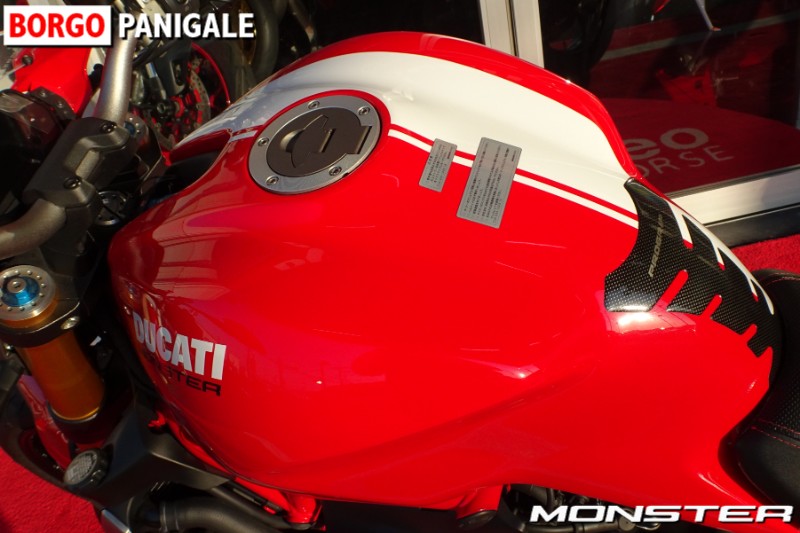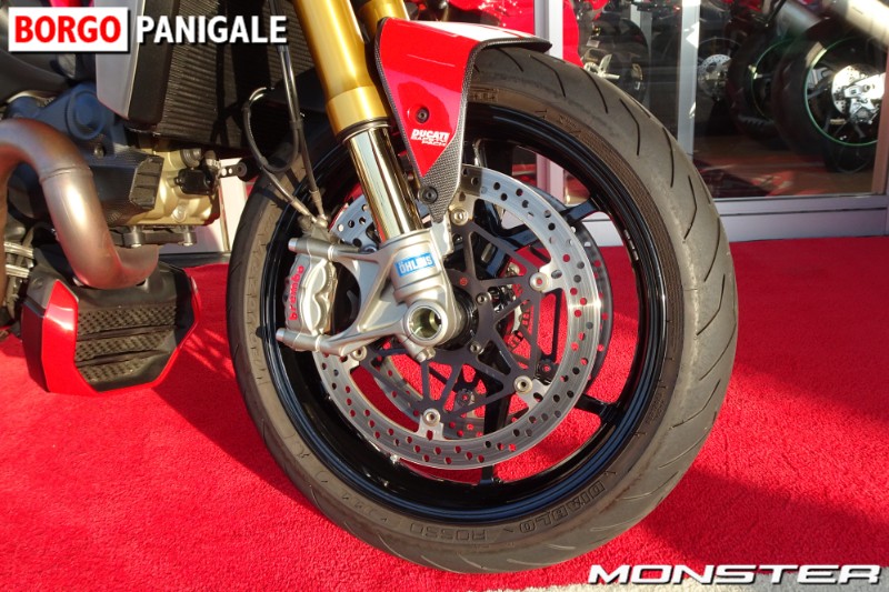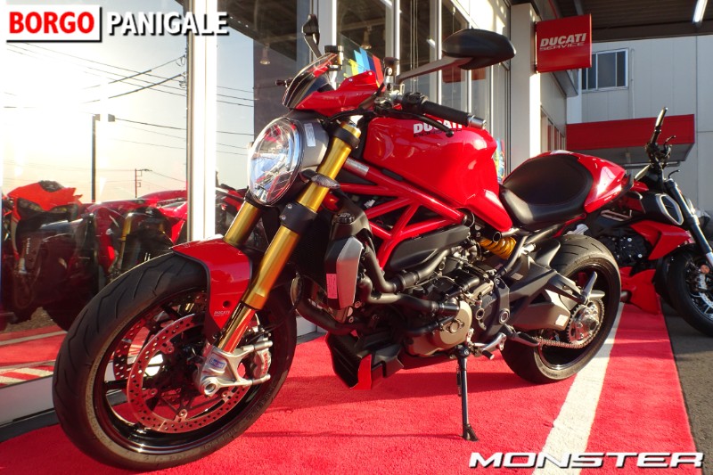 前後のオーリンズサスペンション、M40モノブロックキャリパー、ドゥカティレッドにホワイトのストライプ、ヘッドライト上のビキニカウルなど、標準仕様の1200からグレードアップしたカスタムが施されております。