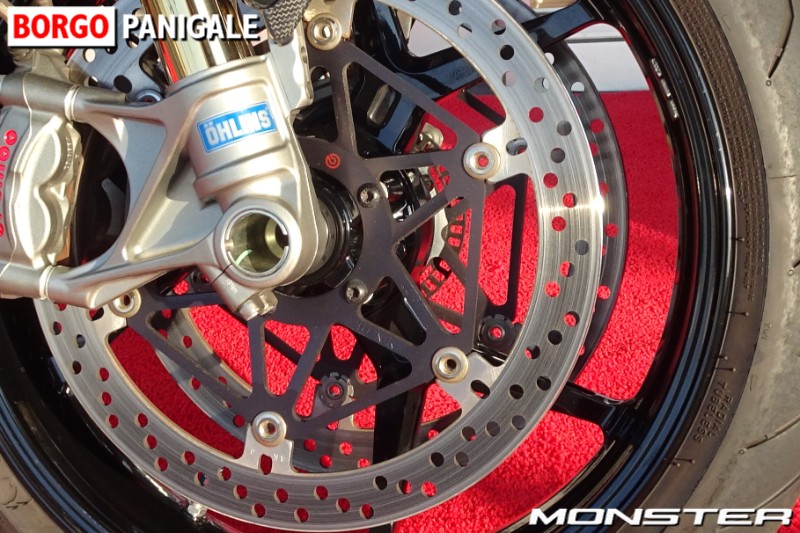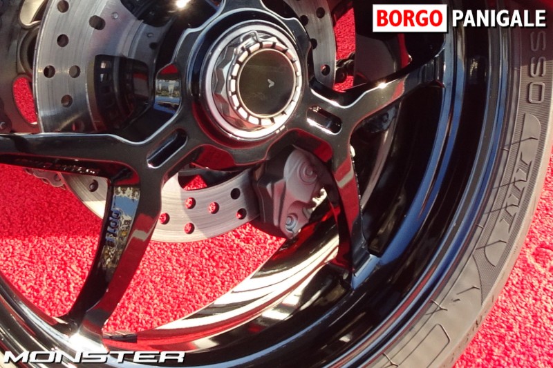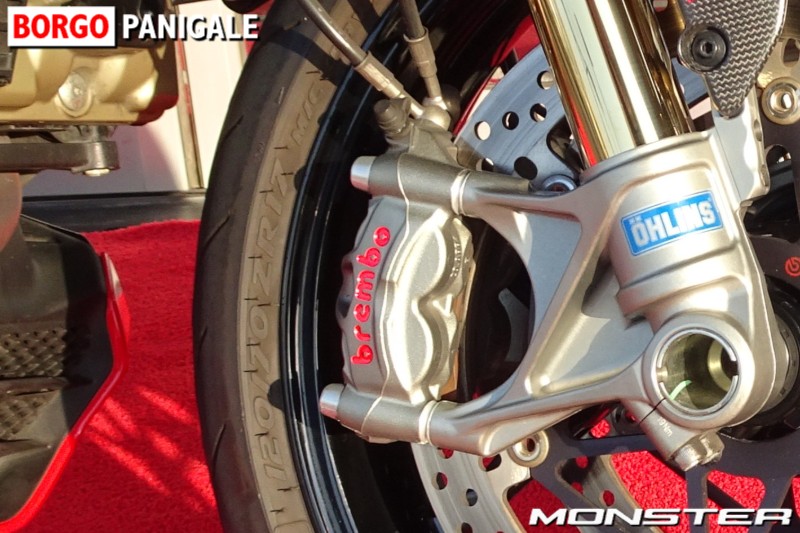ブレンボ製M50モノブロックキャリパー、330mm径のセミフローティングローターをフロントに採用、リヤにはブレンボ 2ピストンキャリパー、245 mm径ディスクを装備。