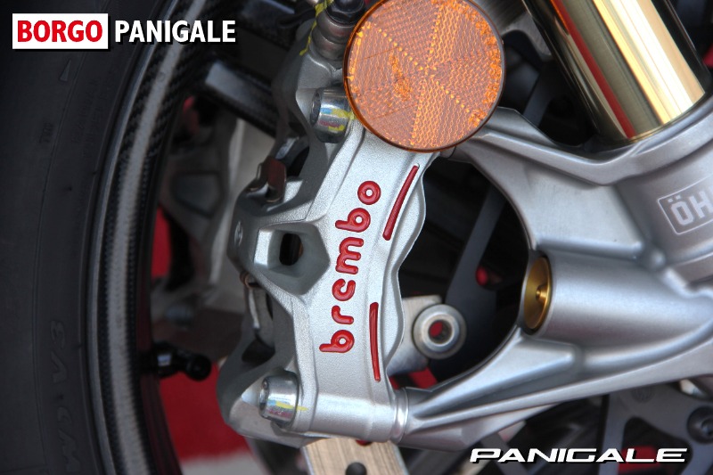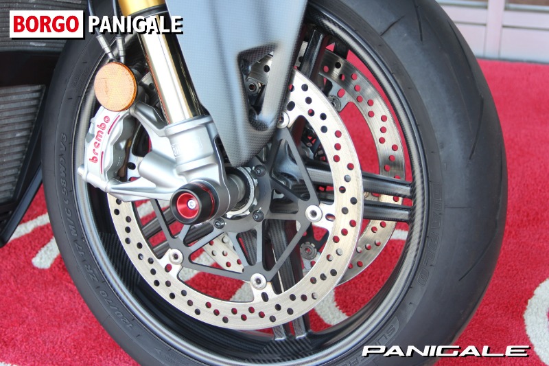 前後のホイールには、BSTのカーボンホイールを標準装備。パニガーレV4 SやパニガーレV4R に装着されている、アルミ鍛造ホイールと比べて1.4㎏も軽くなっております。遠心方向への慣性モーメントが非常に低くなるため、ブレーキング時のコントロール性向上、実際の制動力にも大きく貢献するのがカーボンホイール。ご存じの方も多いと思いますが、とても高価で上質なホイールが付いております。