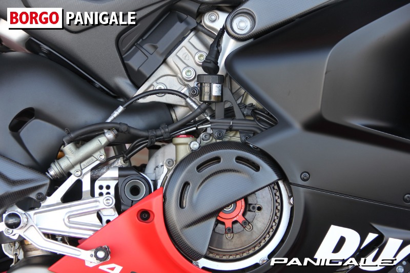標準装備のドライカーボン製フロントフェンダーや、バイプレイウイングに合わせ、リヤフェンダー、フレームカバー、スプロケットカバー、スイングアームプロテクター、ドライクラッチカバー等も、ドゥカティパフォーマンス製のドライカーボンパーツで、埋め尽くされております。